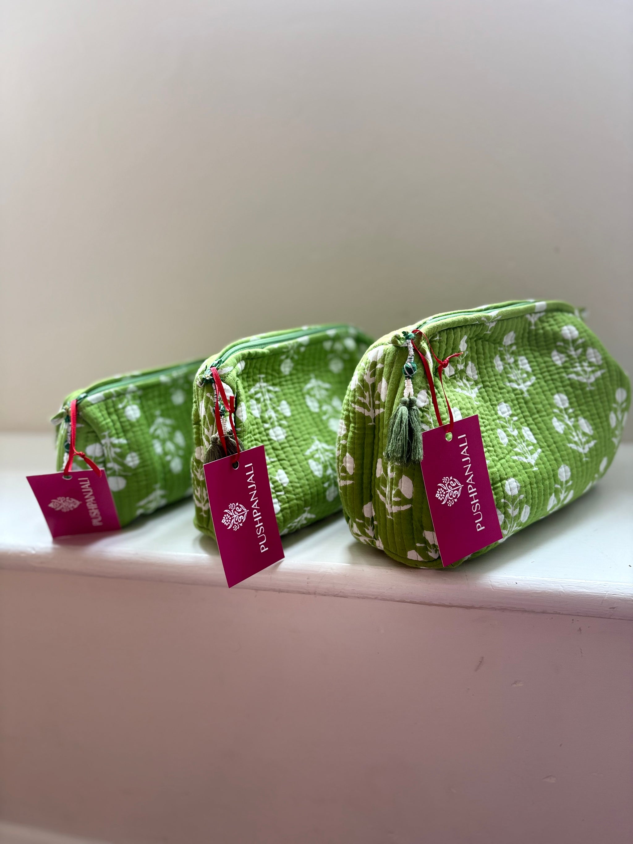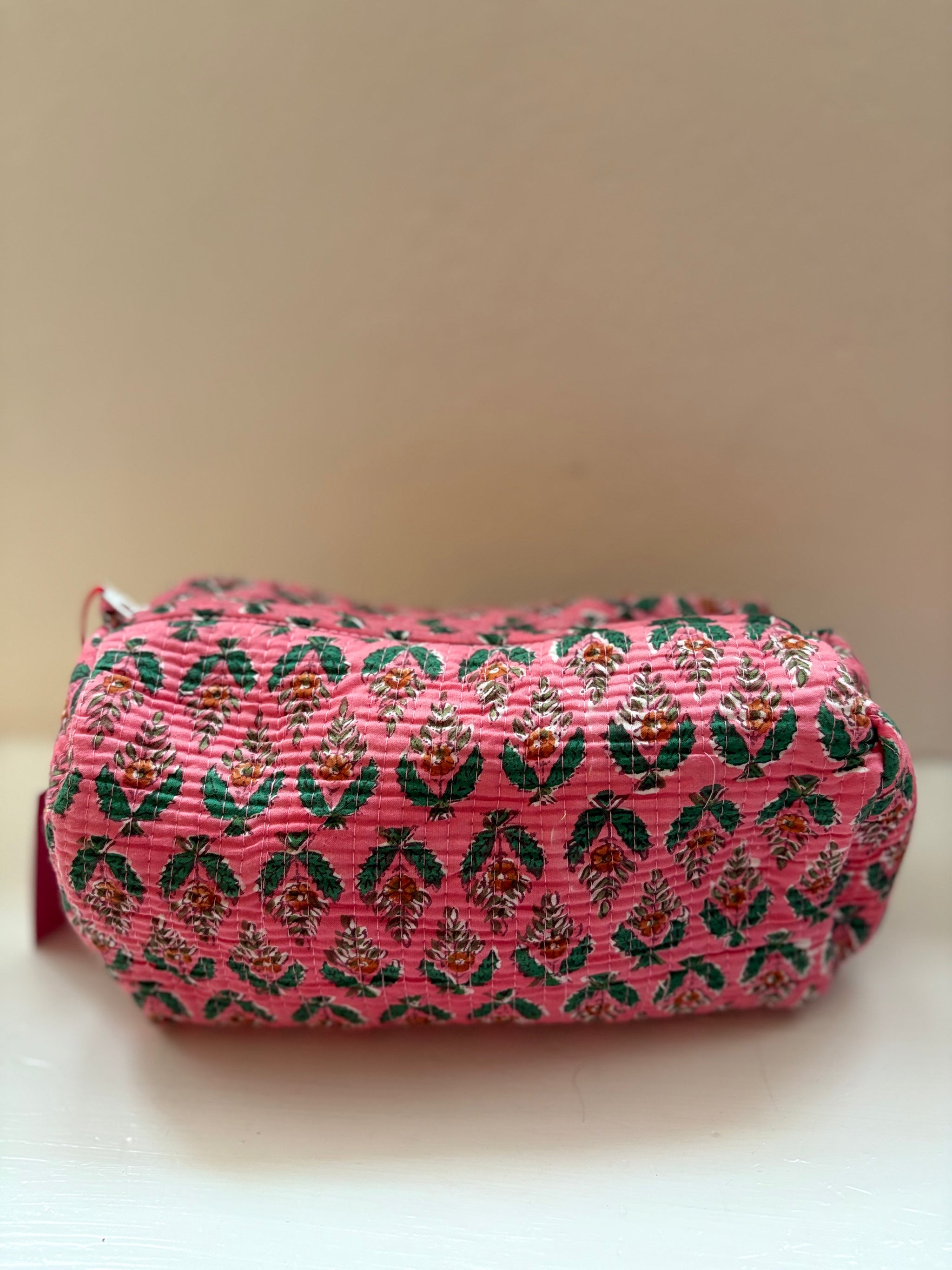 Our block printed quilted wash bags are lined with plastic and come in 3 sizes