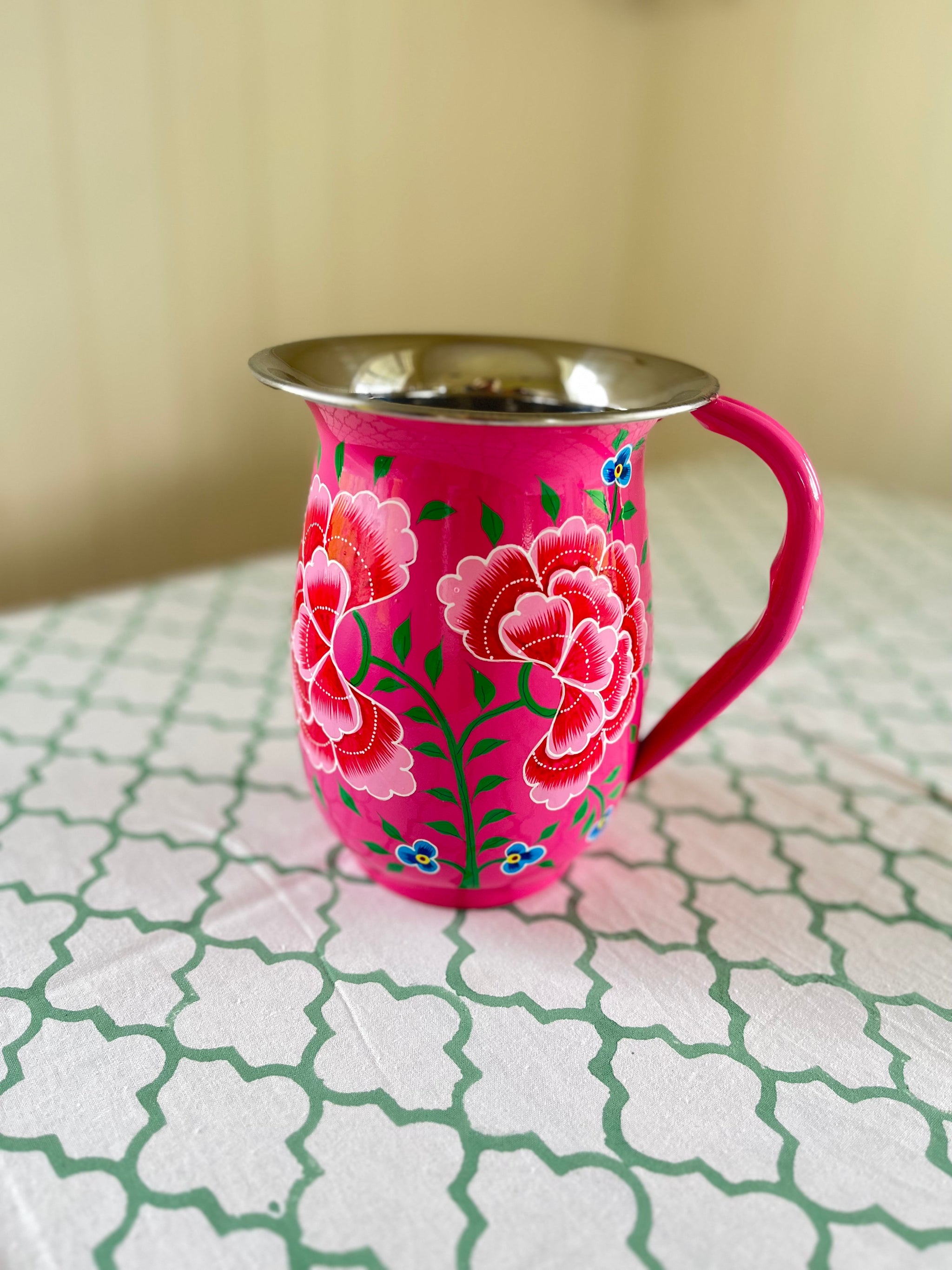 These distinctively shaped colourful jugs are made from stainless steel and are hand painted in Kashmir with a traditional floral design.